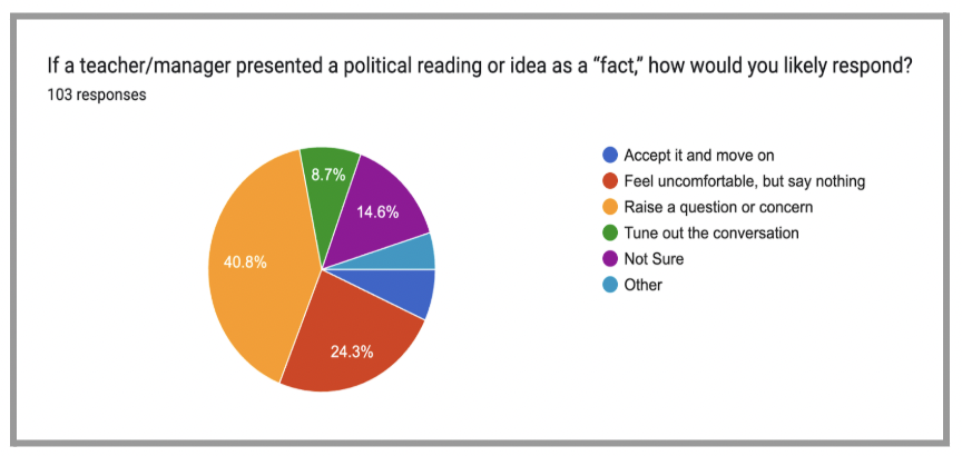 Another significant theme that emerged in both scaled responses and written comments was discomfort when political material was presented as fact by authority figures such as professors or managers. While the content itself was not always controversial, the way in which it was framed, without space for alternative interpretations or critical engagement, contributed to a sense of ideological rigidity. Respondents described this approach as discouraging, particularly when disagreement was implicitly equated with ignorance or moral failing. One participant noted, “It’s not that I don’t agree with what’s being taught, it’s that there’s no room to ask questions about it. It’s presented as if there’s only one correct perspective.” Another reflected, “When someone in authority shares political content as if it’s settled truth, it makes it almost impossible to speak up without sounding combative or ‘wrong.’” These dynamics suggest that even politically aligned individuals may feel hesitant to engage when the framing of content precludes critical examination. The authority of the speaker amplifies the perceived risk, reinforcing silence and conformity rather than open dialogue. This dynamic is reflected in Chart 3, where over 40% of respondents reported either disengaging or remaining silent when political opinions were presented as fact by an authority figure illustrating how such framing discourages meaningful participation even among those who might otherwise be engaged.