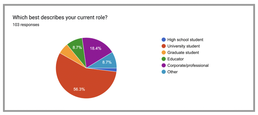 A quantitative survey was administered to a diverse group of respondents, including high school and university students, graduate students, educators, and corporate professionals. A small subset of respondents also identified as “Other,” which may include stay-at-home parents, unemployed individuals, or those outside traditional academic or corporate roles. The survey included 17 questions and incorporated multiple-choice, Likert-scale, and optional short-answer formats. 103 complete responses were collected and analyzed.