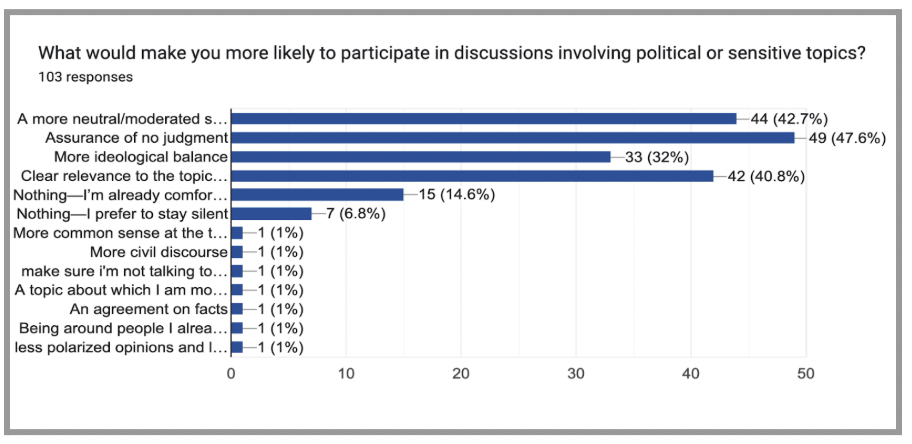 In conclusion, the data reveals that political discussions in shared spaces are marked by a tension between visibility and silence. While such conversations occur with some frequency, meaningful engagement is often hindered by perceived ideological dominance and fear of social consequence. Over 100 participants across the political spectrum indicated a desire for more neutral, moderated, and inclusive environments that allow for thoughtful expression without personal risk. If institutions aim to cultivate genuinely open dialogue, they must move beyond rhetorical commitments to openness and begin implementing structures that make such dialogue possible.