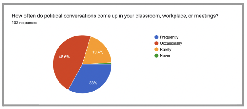 The data also revealed a perception among respondents that political dialogue has become increasingly performative or polarized. Several comments referenced a lack of genuine engagement or nuance, stating that participants often “just recycle talking points” or that “people only speak up when they’re surrounded by like-minded individuals.” This climate discourages exploratory thinking and deep engagement, and instead fosters ideological echo chambers. One respondent noted, “Politics has become too polarized. Everyone has their mind made up one way or the other, and constructive conversation is few and far between.”
